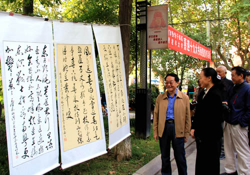 10月14日上午,市委老干部局、邳州老年大学在人民公园共同举办了“喜迎十九大书法美术摄影与剪纸作品展”,吸引了千余市民前来观看,产生极大反响。这次展览共展出老年大学师生创作的作品书法40幅、美术30幅、摄影30幅与剪纸10幅。通过各种艺术形式,表达对党的崇敬和爱戴之情,赞颂我市五年来改革发展取得的辉煌成,展示老年大学的教学成果和崭新面貌。寄寓丹心,抒发爱党爱国的真挚情怀,引领广大离退休老干部、老党员、老朋友与我们一起共同迎接党的十九大胜利召开,聚焦举世瞩目的历史时光,聆听中国砥砺奋进的铿锵足音。图为市委组织部副部长、市委老干部局局长李凤、邳州老年大学常务副校长谷玉端、市委老干部局副局长纪康元等与市民一起参加展出活动并观看展出。